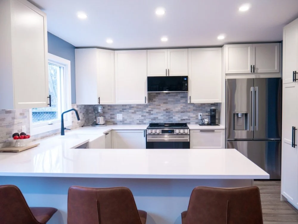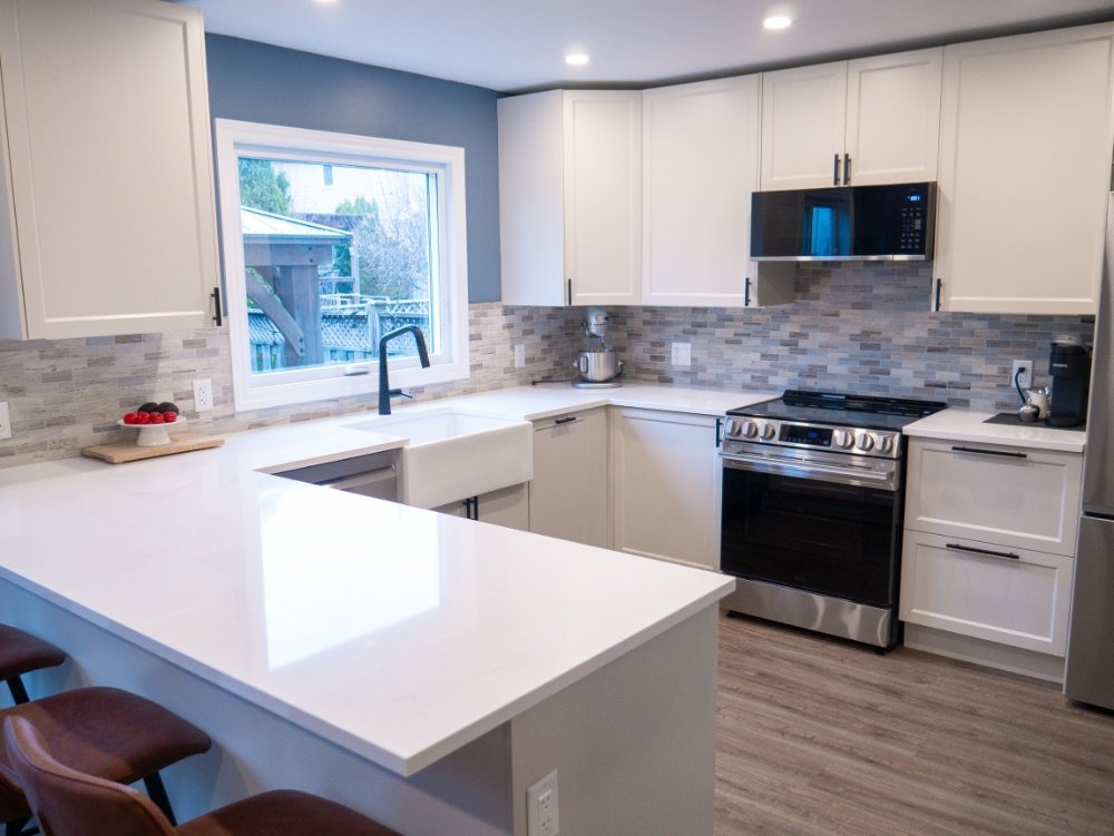 To ground the bright cabinetry, we worked with local distributors to source a rich, wood-look flooring that adds warmth and durability. By shopping locally for our flooring and backsplash materials, we ensured that every dollar spent on this renovation supported the Ottawa economy.