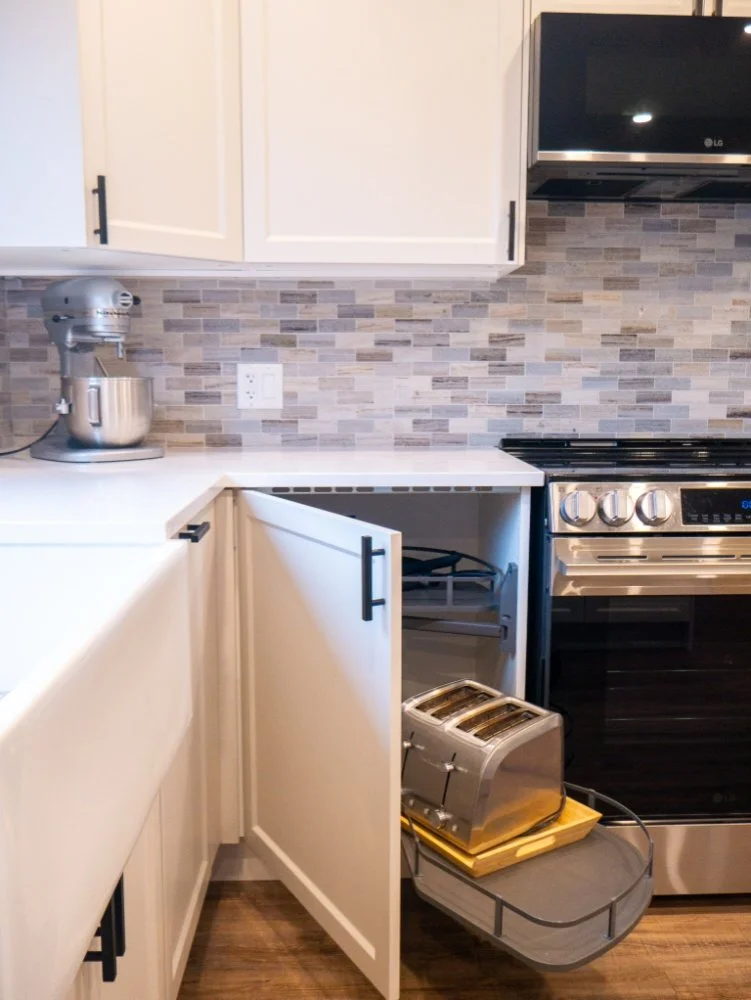 The "Magic Corner": We installed a swivel pull-out for the toaster and small appliances, ensuring that the corner cabinet is no longer a "black hole."